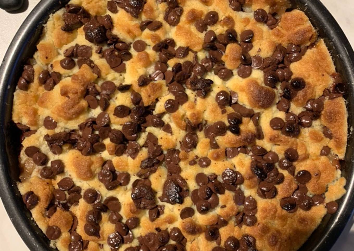 - Ajouter les bananes et poires. Puis mettre la pâte émiettée dessus avec les petits morceaux de chocolat. (La j’ai mis des pépites de chocolats).