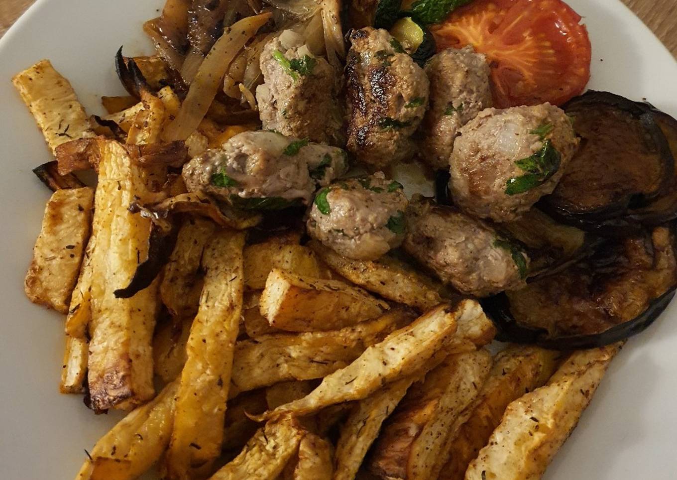 - J ai accompagné le mien, d aubergines, courgettes, tomates, oignons et kefta frits.