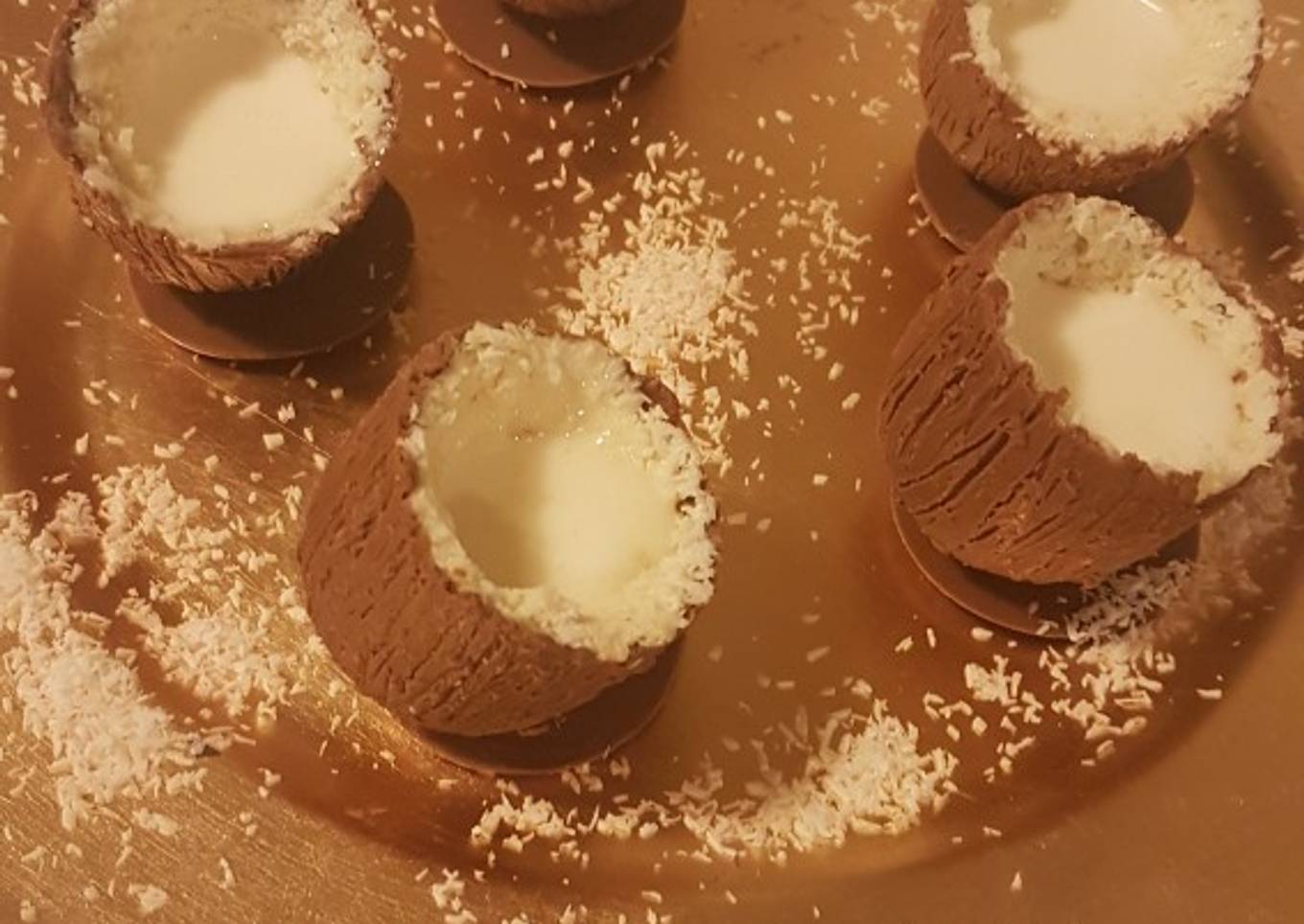 - Mettez la noix de coco et le chocolat blanc fondu ou 'vous pouvez la remplacer de lait de coco) fait une pâte et remplissez les moules mais pas complètement, griffé la noix de coco avec une fourchette pour qu'elle soit plus réaliste