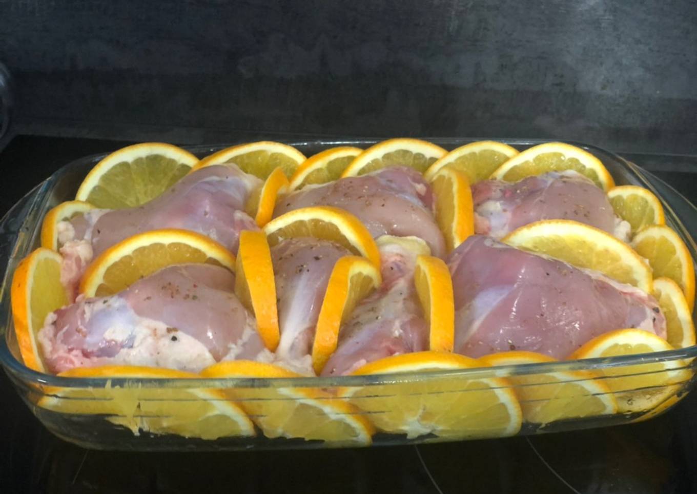 - Mélanger le jus de deux oranges, l’huile d’olives et la sauce soja et verser sur les cuisses de poulet. Laisser mariner pendant 3-4 heures.