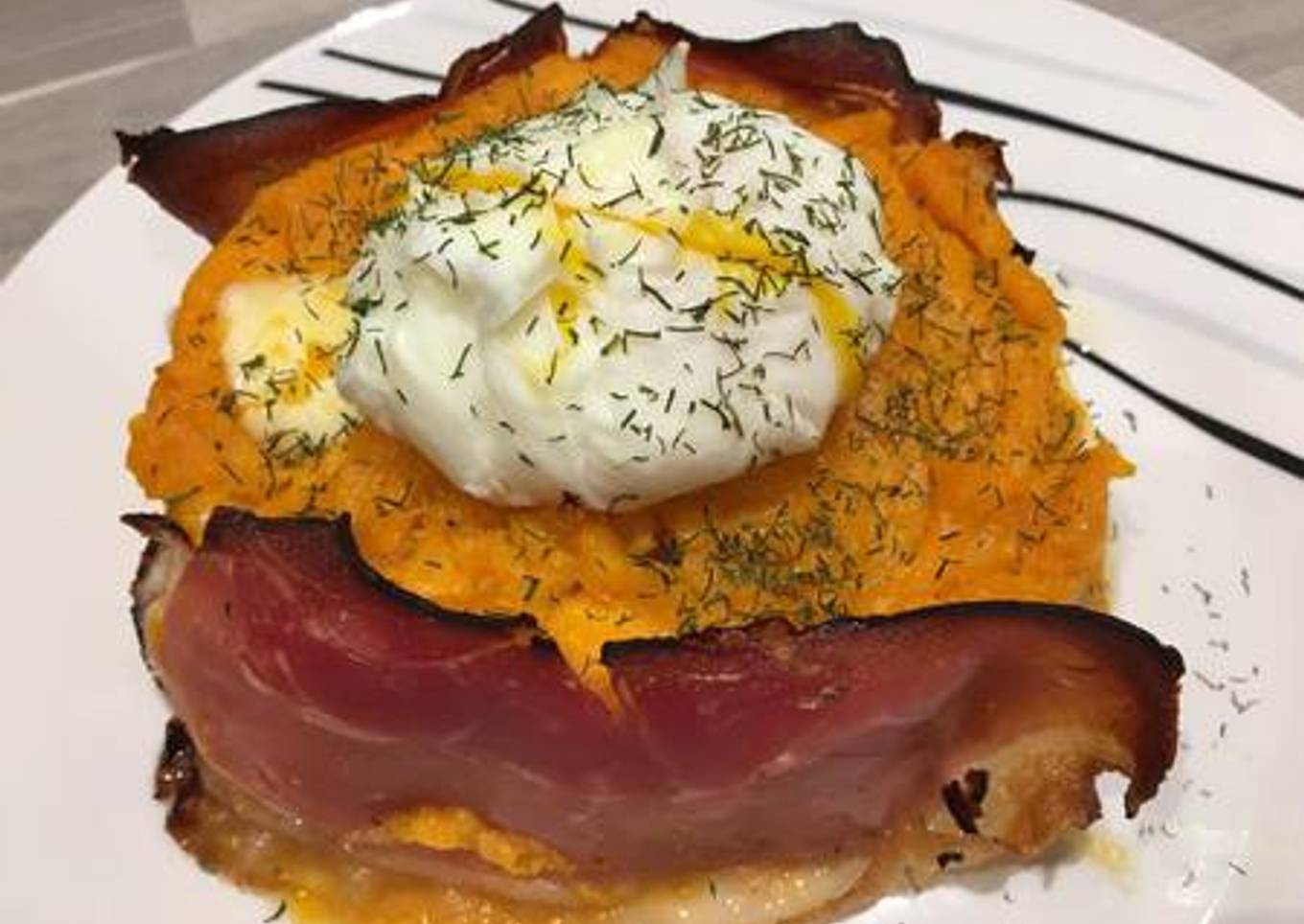 Purée de Patate douce enroulée dans sa tranche de Jambon Fumé et Œuf poché