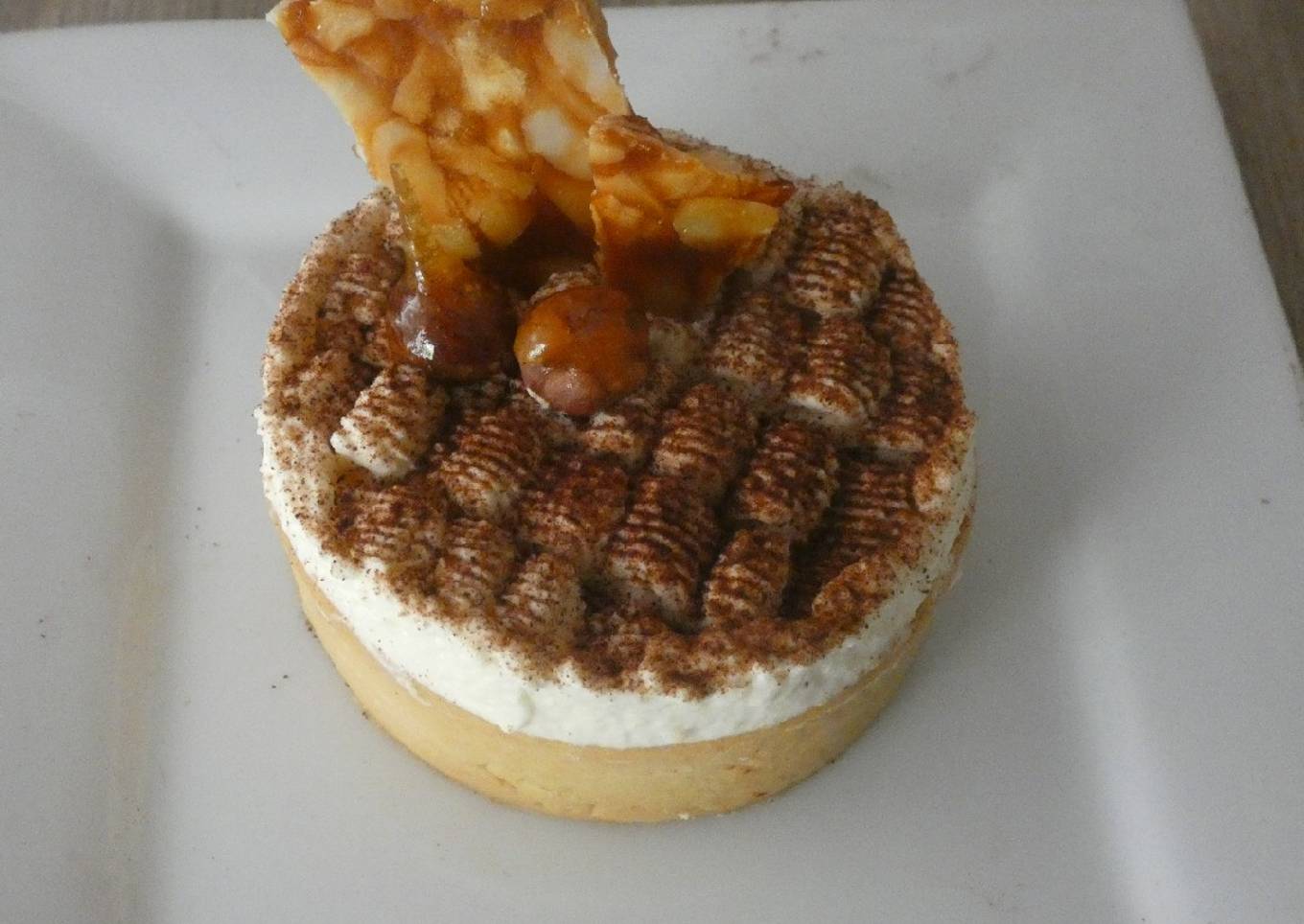 - Lissez la surface de la tarte avec de la chantilly puis faites des volutes avec une poche a douilles. Saupoudrez d'un mélange cannelle cacao puis ajoutez si vous le voulez des noisettes enrobées de caramel et de la croquante aux amandes pour décorer